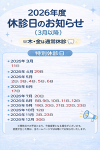 それに加え、祝日・長期休暇等により、下記日程は特別休診日となります。